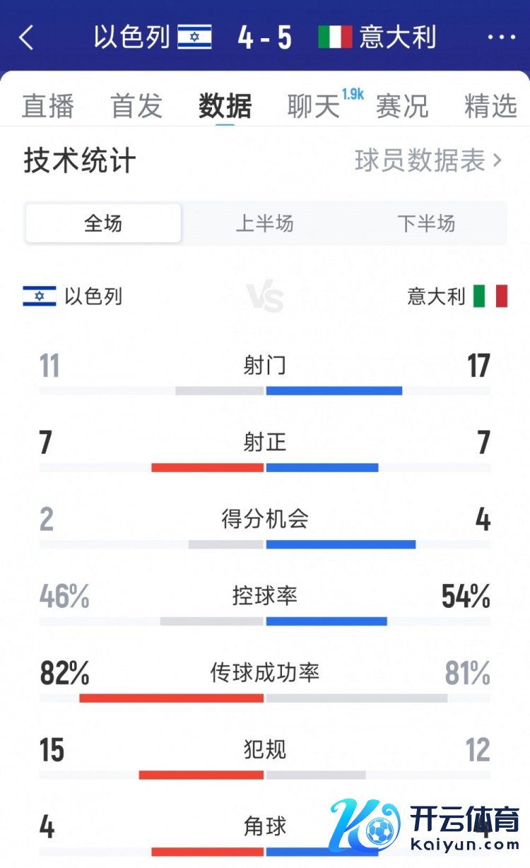 以下为两边全场数据对比:以色列vs意大利射门:11-17射正:7-7得分契机:2-4控球率:46%-54%传球到手率:82%-81%犯规:15-12角球:4-4世界杯体育信息