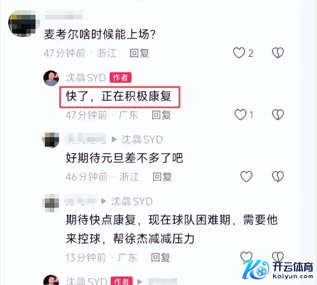 国内中枢球员崔永熙、胡明轩、杜润旺等东谈主轮替因伤缺席。休赛期委用厚望的新援麦考尔也迟迟未能登场。他缺席,是广东队后场最千里重的赔本之一。之前,有球迷问麦考尔的牙东谈主,得到陈说说“快了,正在积极康复”,这让球迷们骤然抱有但愿。