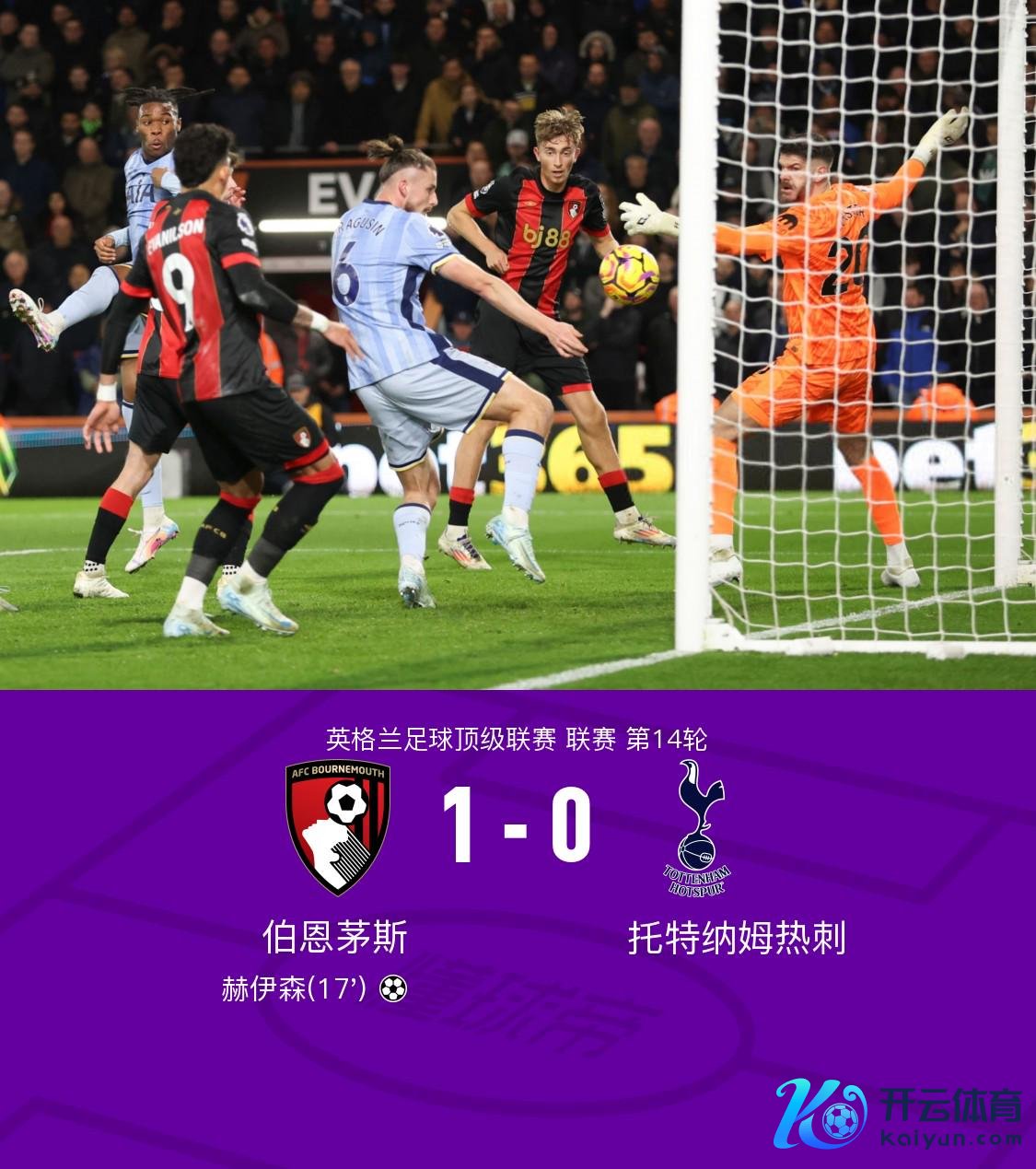 第17分钟,伯恩茅斯开出角球,赫伊森头球破门,伯恩茅斯1-0