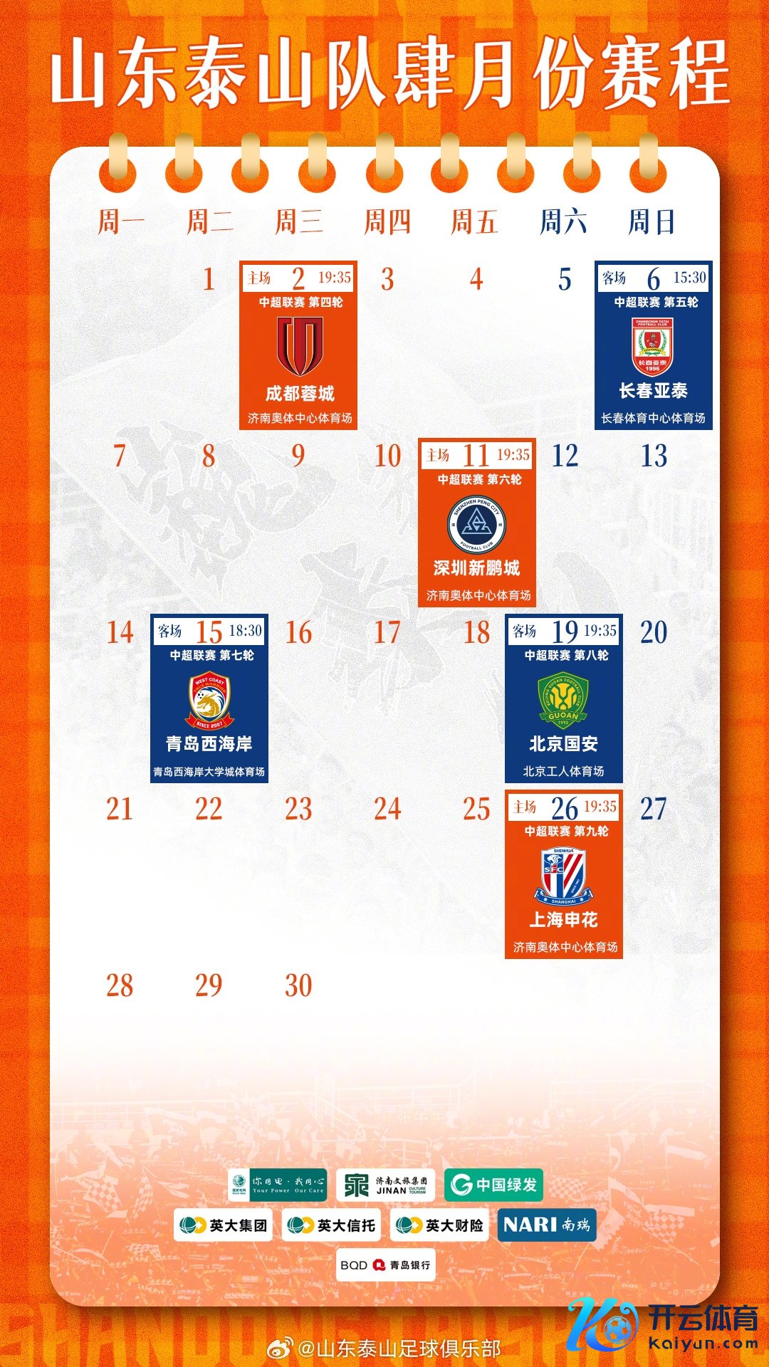 山东泰山队四月份赛程世界杯体育信息