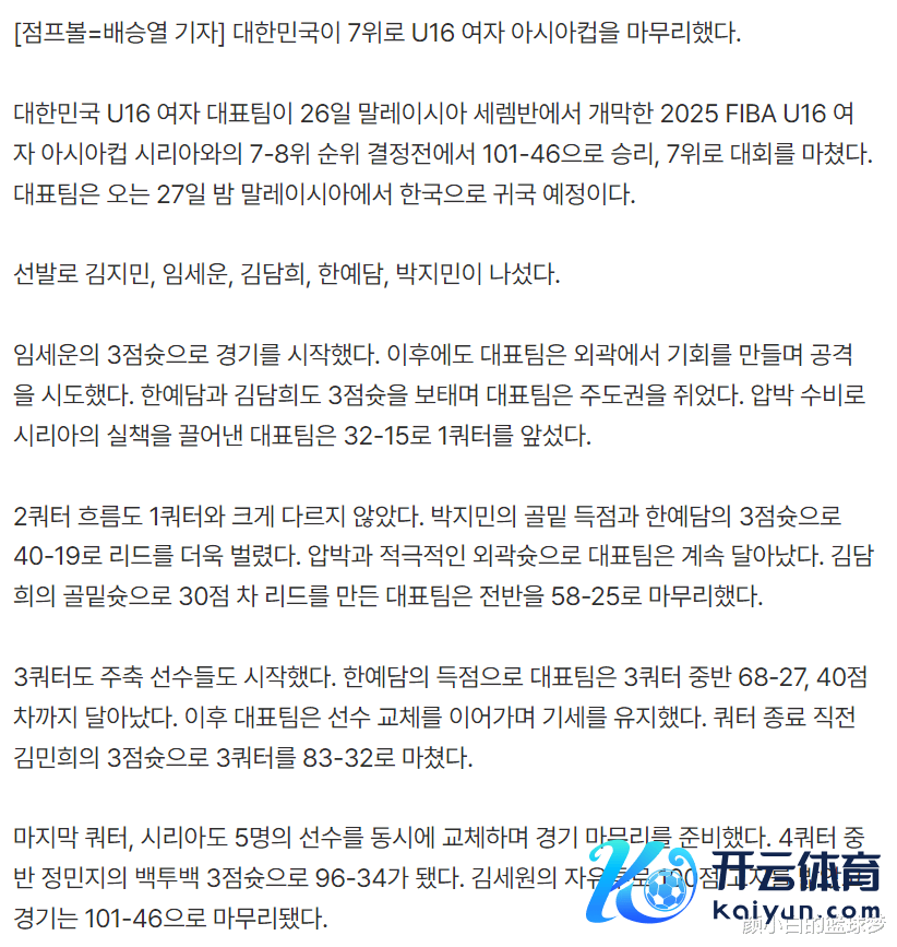 北京时分9月26日,2025年U16女篮亚洲杯7-8排位赛,韩国女篮101-46大捷叙利亚女篮拿到本届亚洲杯唯独一场告捷。这场比赛是一边倒的态势,首节韩国队就打出32-15的攻防波澜,半场依然异常33分,比赛早早失去悬念。