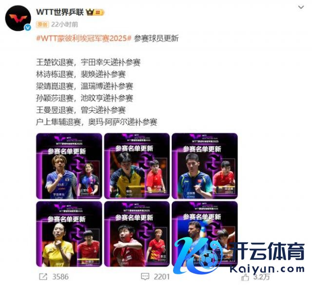 WTT 官方公布的退赛名单险些囊括了国乒重生代与中生代的领军东说念主物,男队三大中枢王楚钦、林诗栋、梁靖崑和女队两大王牌孙颖莎、王曼昱一都在列,跟着主力退赛,替补参赛的通顺员名单也随之详情:王楚钦的席位由世界名纪律 26 位的日本选手宇田幸矢接替,林诗栋的限额由澳大利亚选手裴焕赢得,梁靖崑退赛后,中国小将温瑞博赢得递补参赛履历;女片面,孙颖莎与王曼昱的空白分歧由澳大利亚选手池旼亨和新加坡选手曾尖填补