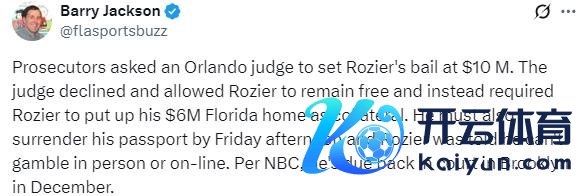 热火随队记者 Barry Jackson 报谈,放哨官申请奥兰多法官将罗都尔的保释金定为 1000 万好意思元。法官停止了,允许罗都尔持续保释,但条件他提供其价值 600 万好意思元的佛罗里达房产作为典质。据 NBC 报谈,他将于 12 月在布鲁克林再次出庭受审。