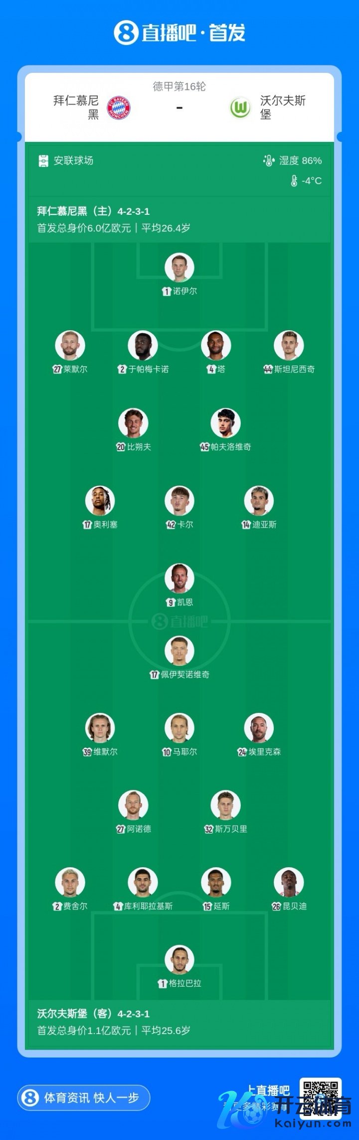 01月11日讯 德甲第16轮,拜仁慕尼黑主场迎战沃尔夫斯堡,赛前首发名单公布。