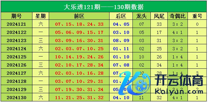 大乐透第2024130期出奖号统计:前区11、21、25、31、32,后区04、10。龙头11,凤尾32,奇偶比4:1,开出1枚重号。