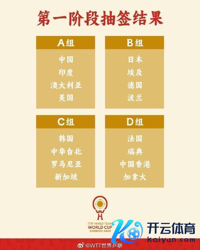 11月30日,2024年景王人海外乒联混杂团体寰宇杯抽签典礼举行。中国与印度、澳大利亚、好意思国同在A组。