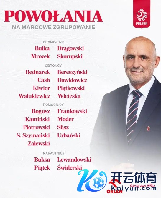波兰新一期大名单 门将:布乌卡(尼斯)、德龙戈夫斯基(帕纳辛奈科斯)、姆罗泽克(波兹南莱赫)、斯科鲁普斯基(博洛尼亚) 后卫:贝德纳雷克(南安普顿)、贝雷申斯基(桑普多利亚)、卡什(阿斯顿维拉)、达维多维奇(维罗纳)、基维奥尔(阿森纳)、皮翁特科夫斯基(卡斯帕萨)、瓦卢凯维奇(王人灵)、维泰斯卡(塞萨洛尼基) 中场:博古什(蓝十字)、弗兰科夫斯基(加拉塔萨雷)、卡明斯基(沃尔夫斯堡)、莫德尔