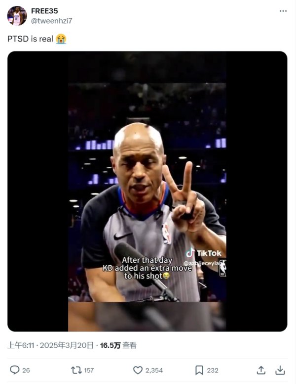 网友晒视频,自从2021年东部半决赛篮网VS雄鹿的G7,杜兰特绝杀踩线变绝平之后,杜兰特似乎就在投篮的技术齐会专诚多加一个垂头看线的作为。 网友写谈:“PTSD(创伤后应激辞谢)是简直。” 杜兰特也转发了这个视频,配上了代表PTSD的经典方法包,暗意招供。 体育集锦......【更多...】
