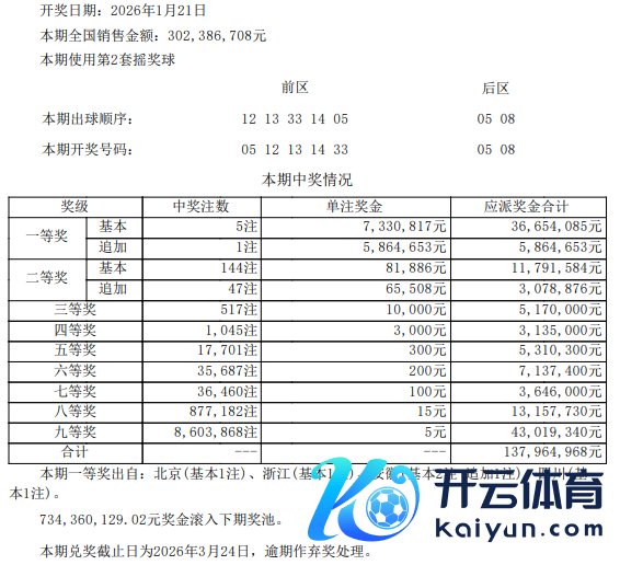 北京时代1月21日晚,体彩大乐透第26009期开奖,当期开奖号码为前区05 12 13 14 33体育录像/图片,后区05 08。