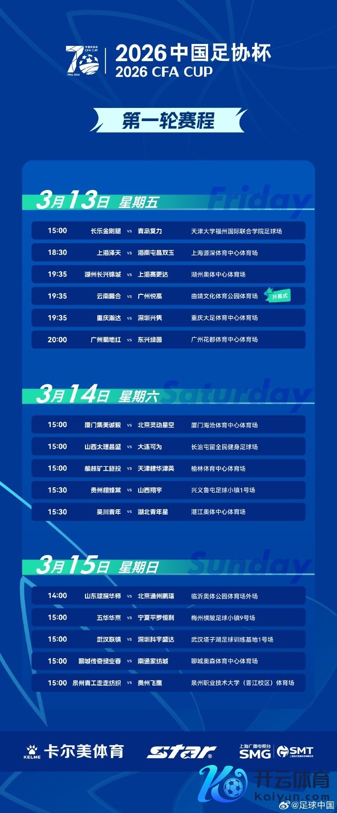 3月12日讯 足球中国官方公布了足协杯第一轮赛程,3月13日至3月15日,32支球队将张开对决。