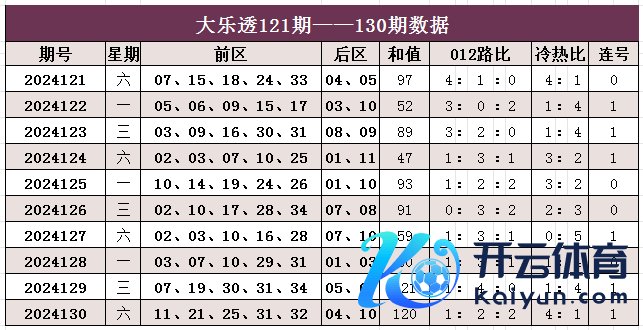 大乐透第2024130期出奖号统计:前区11、21、25、31、32,后区04、10。和值120,012路比1:2:2,冷热比4:1,开出1组连号。