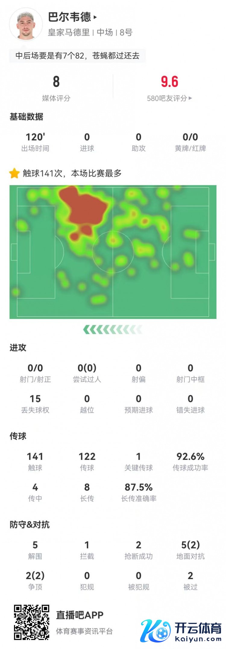 3月13日讯 皇马在本轮欧冠点球淘汰马竞,巴尔韦德本场数据如下: