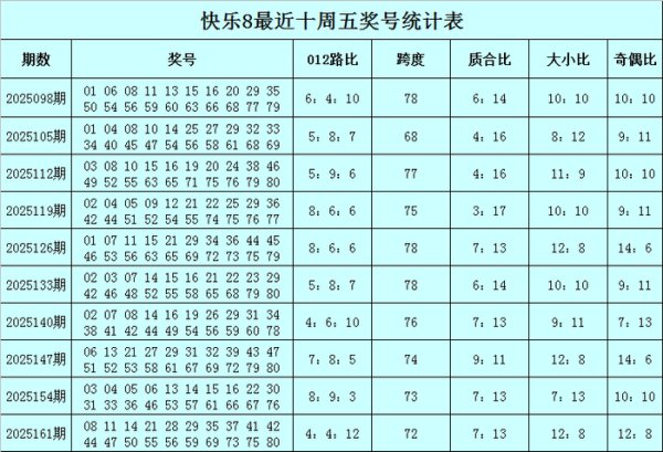 福彩惬心8第2025167期开奖总结:0713202227293033343536476368707172747580,其中奖号012路比为7:5:8,跨度为73,质合比为5:15,大小比为9:11,奇偶比为10:10。 福彩惬心8第2025161期(上周五)开奖总结:0811142128293537414244475055565969737580,其中奖号012路比为4:4:12,跨度为72,质合比为7:13,大小比为12:8,奇偶比为12:8。 周五012路分析:最近5周......【更多...】