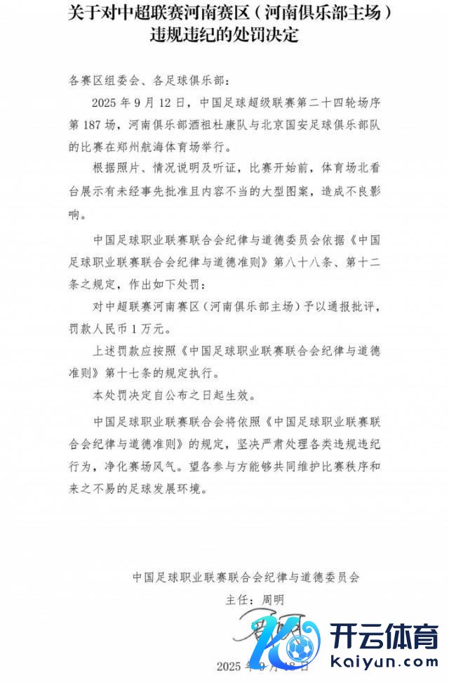 对中超联赛河南赛区(河南俱乐部主场)给以通报月旦罚金东说念主民币1万元。