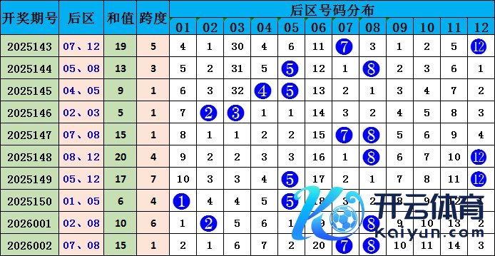 后分辩析:大乐透后区上期开非凡偶组合,跨度1。近10期后区奇偶组合出现5期,偶奇组合出现2期,奇奇组合出现1期,偶偶组合出现2期;近10期后区两码跨度1-5开出8次,6-11开出2次,本期后区两码详细推选:07、12。