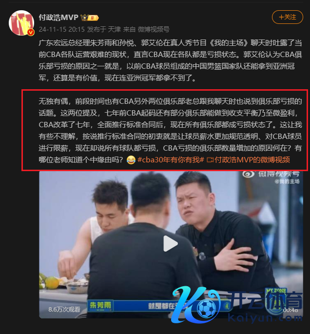 媒体东说念主付政浩在转发了这3东说念主这段一皆吃饭聊天的视频后,还知道了一些音书,那即是有两位CBA俱乐部老总在跟他聊天时也说到球队亏空的问题,在7年前CBA俱乐部还大概作念到出入均衡以致微盈利,但改革了7年,当今整个俱乐部都成了亏空的状态。