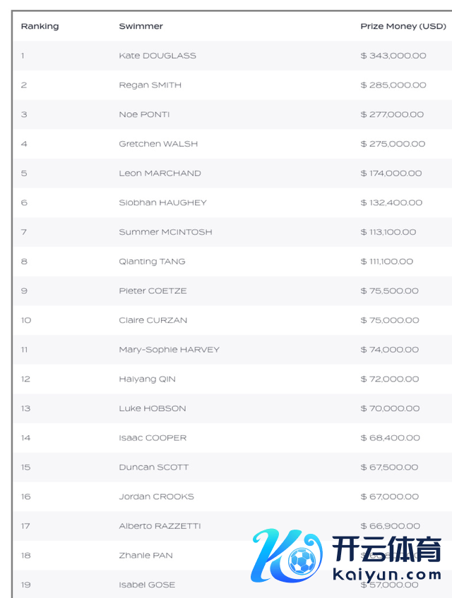 在此之前,来自全国列国的拍浮指点员一共取得来自全国泳联颁布的所有710万好意思元的奖金,而全国泳联是凭证拍浮指点员在过去度的赛事推崇和获奖排行来决定的奖金若干,中国拍浮员唐钱婷、覃海洋、潘展乐凭借自己的优厚推崇入围2024年拍浮指点员年收入排名榜,买卖价值取得了宏大的升迁,收效闯入了全国泳坛年收入前20名。