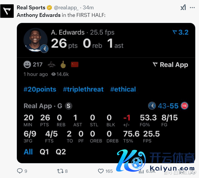 次节爱德华兹休息了4分钟,他登场后又射中三个三分球,单节7中4拿到13分,半场爱德华兹20分钟,15中8,三分9中6,拿到26分1助攻,正负值-1,半场打完爱德华兹如斯炸裂还逾期12分,这那儿说理去?