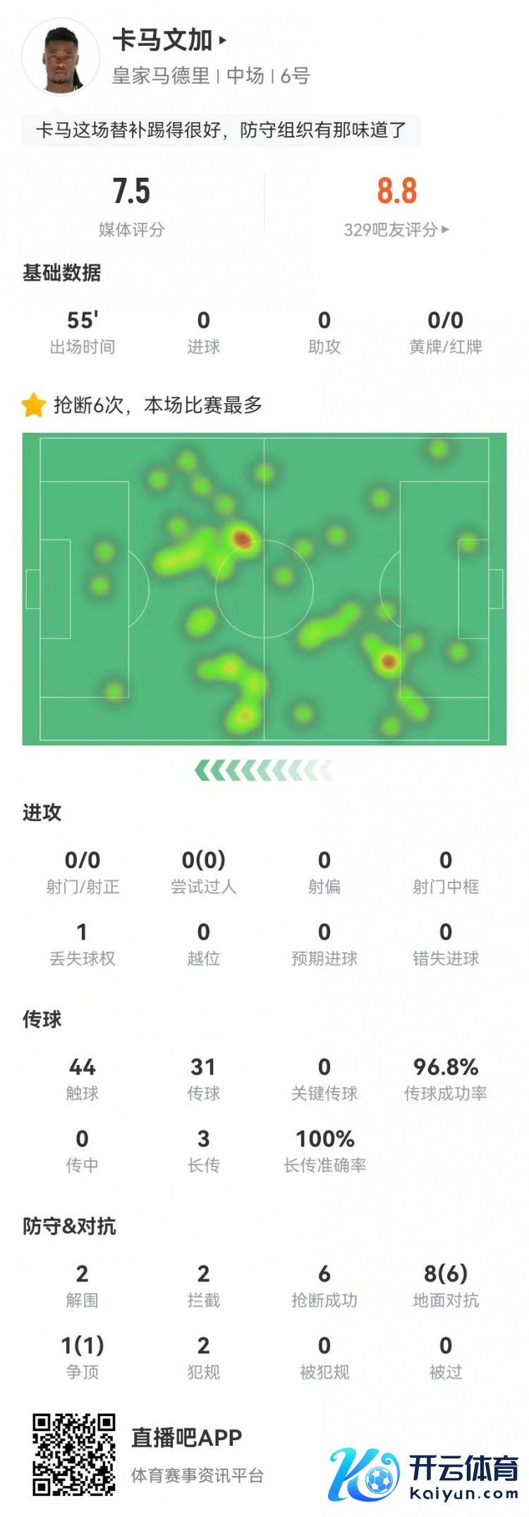3月13日讯 皇马在本轮欧冠点球淘汰马竞,卡马文加数据如下: